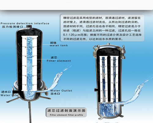 多芯精密過濾器是一種常見的過濾設(shè)備,可以用來過濾原水中殘存的微量懸浮顆粒、膠體、微生物等,隨著制水時間的增長,濾芯因截留物的污染,其運(yùn)行阻力逐漸上升,當(dāng)運(yùn)行至進(jìn)出口水壓差達(dá)0.1MPa時,應(yīng)更換濾芯。多芯精密過濾器采用成型的濾材,在壓力的作用下,使原液通過濾材,濾渣留在管壁上,濾液透過濾材流出,最終達(dá)到過濾的目的。